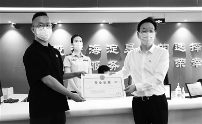 本报讯(记者 周美玉)昨天,在海淀区政务服务大厅,北京艾纳医学检验实验室有限公司的代表从北京市市场监管局党组书记、局长高念东手中接过了北京市第一张加载“市场主体身份码”(以下简称“企业码”)的营业执照。据了解,这是全国市场监管部门发出的首张加载“企业码”的营业执照。今后,社会公众通过扫描营业执照上的“企业码”,即可查看该企业的执照信息和“一照多址”信息。