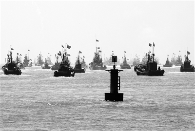 9月1日,黄渤海为期4个月的休渔期结束,所涉渔区渔船陆续出海,有序开展秋汛捕捞作业。图为在青岛西海岸新区积米崖海域,渔船驶离码头。