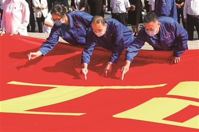 随着房山区人大常委会党组副书记、常务副主任,区总工会主席齐文东在堂上村的党旗广场宣布活动开始,一面长20米、宽10米印有“奋进新征程 建功新时代——首都职工喜迎二十大”字样的巨型横幅在各行各业劳动者的手中徐徐展开。参加活动的劳动者代表纷纷在横幅上书写暖心寄语,为迎接党的二十大胜利召开送上最真挚的祝福。