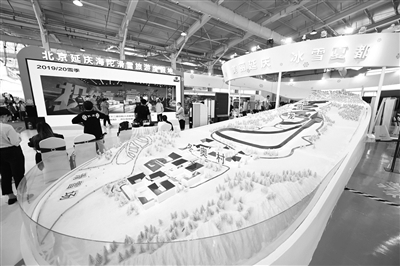 在体育服务专题展展区,延庆区独具匠心的场馆设计夺人眼球,展区上方的主体建筑结构节选“雪游龙”赛道最惊险刺激的部分曲线,下方以大型倾斜沙盘作为亮点,突出延庆冰雪场馆的高识别度。