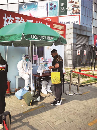 “请大家保持安全距离。”“请大家拿出手机扫码……”这几句话,在两个多月的时间内,西罗园街道总工会专职工会社会工作者孙鹏重复了无数次。每天早上起床后,他便第一时间奔赴西马场北里社区的银泰百货。在这里,孙鹏化身“小蓝”,积极维持核酸检测现场秩序。核酸采集人员紧张时,他又化身“大白”,负责核酸采集的扫码登记工作。
