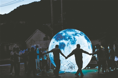 天色将晚,在篮球场,巨型3D“月球”已经“支愣”起来,散发出柔和的光芒,“围球夜话”活动将在这里进行。