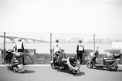 “八月十八潮,壮观天下无。”中秋节前后是一年中观赏钱塘江大潮的最佳时机,也是汛期里防潮队员们最忙碌的时候。连日来,为保障观潮市民和游客的安全,浙江省杭州市萧山区新街街道的防潮队员高哨峰、傅帮华、贾文军忙着在江堤上巡逻。他们要看护一段1.9公里长的钱塘江岸,每天负责劝导观潮人远离危险地段、劝返下江堤垂钓的钓鱼人、检查江岸边的防护设施,被称为“喊潮人”。目前钱塘江两岸共有“喊潮人”372名。图为防潮队员傅帮华、贾文军、高哨峰(从左到右)在钱塘江边一处时常有人下堤垂钓的地点瞭望。