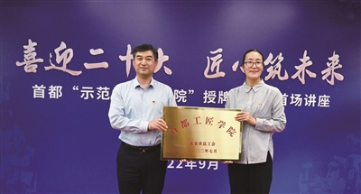 本报讯(记者 白莹 通讯员 孙越)“咔嚓”“咔嚓”……随着一阵照相机的快门声,在“喜迎二十大、匠心筑未来”的蓝底白字大背景板前,北京市总工会职工大学党委书记刘蓉从北京市总工会党组书记、副主席张良手里接过“首都工匠学院”的金色牌匾,场下响起一阵雷鸣般的掌声。此时50多名由全国大工匠和北京大工匠以及受聘于北京市总工会职工大学的职工匠师都使劲地鼓着掌,从此,他们有了自己的“大本营”——首都工匠学院。