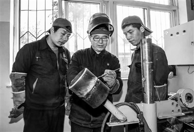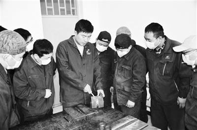 在首钢矿业公司培训中心焊件展示室内,张钊正站在学员们中间传授技术心得,而在旁边的操作室,王涛逐一查看学员们的焊接作品,针对存在的不足,详细指出改进方法。