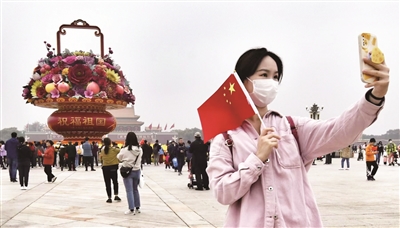 天安门广场上,“祝福祖国”大花篮吸引了最多人的注目。这张首都“金名片”以盛世繁花迎国庆,寄托了中华儿女对祖国母亲的深深祝福。来自五湖四海的游客,在这个巨型花果篮前合影留念。大家脸上洋溢着喜悦的笑容,共同庆祝新中国成立73周年。
