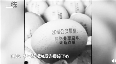 近日,因鸡蛋在当地较为畅销,民警和超市、商铺协商后,编了几句顺口的防诈标语,用印章印在待销鸡蛋上。无论是市民买鸡蛋还是用鸡蛋时都能看到。据悉,这样的“反诈蛋”已印了1000多枚,收到不少网友好评。