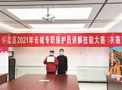 平时,杜宗军一有时间就在网上学习有关长城方面的知识,用长城文化底蕴来充实自己。 2021年12月7日,在怀柔区长城专职保护员讲解技能大赛决赛上,杜宗军凭借着长期积累的过硬专业技能以及自学的关于长城历史和长城保护知识,从全区131名长城保护员中脱颖而出,获得了唯一一个特等奖。