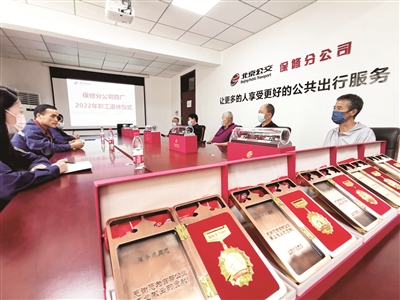 近日,北京公交集团保修分公司四厂工会为2022年度退休职工举行了一场小型的荣休纪念仪式。该厂工会主席为退休职工们发放了荣誉奖牌和退休纪念品。
