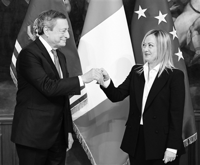10月23日,在意大利罗马,新任总理焦尔吉娅·梅洛尼(右)从前总理德拉吉手中接过主持内阁会议的铃铛。意大利新任政府总理焦尔吉娅·梅洛尼及其内阁成员22日宣誓就职。 新华社发