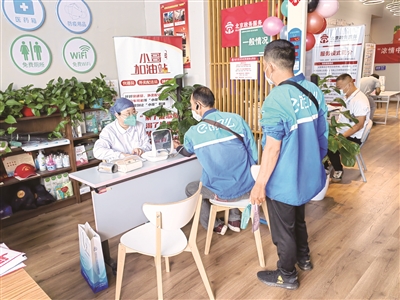 在史各庄街道暖心驿站,工作人员引导快递和外卖小哥们有序排队参加体检。本次活动为到场的新就业形态劳动者送上了健康体检和健康管理服务,现场还为女性劳动者布置了专用空间,方便进行妇科体检项目。