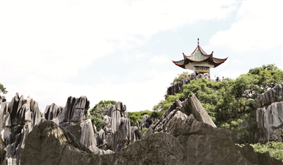 小石林往南是步哨山,因清末石林彝民义军首领赵发曾在此山驻防,设步哨巡山而得名,这里柱石参差,剑峰罗列,可登高远望,观海听涛,石场点兵。从步哨山往西,穿过环林路,就是李子园箐石林,据《路南州志》记载:“相传有人隆冬遥见石上有李二株,果实鲜红,临不及取,次日寻之不见,俗称李子箐。”这里奇柱异石,有聚有散,有起有伏,有如千队万骑,有如形单影只,漫步从容……好多石峰石芽都被赋予人文色彩,它们或象形,如“望夫石”“骆驼骑象”,或拟人,如“苏武牧羊”“母子偕游”。