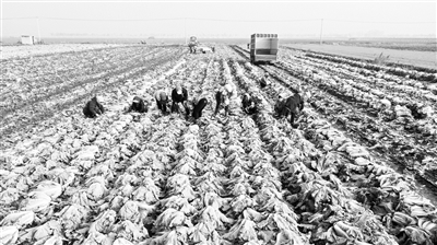 11月21日,河北省唐山市丰南区岔河镇杨义口头村农民在田间收获大白菜。