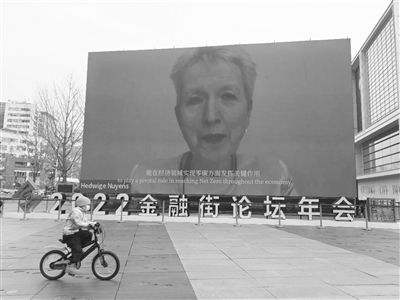 昨天,在2022金融街论坛年会举办地,场外大屏幕播放会议实况。