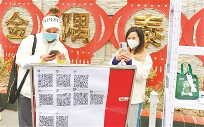 11月24日早晨,在朝阳区金隅泰和园小区内,居民在新建的单元楼微信群里扫码,及时了解防疫信息,并可快捷订购水果、蔬菜等生活物资。