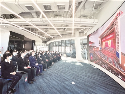 党的二十大开幕当天,丽泽商务区工委、管委会、团工委、机关工会组织机关党员、党外代表、入驻企业党员代表等在丽泽SOHO“丽泽云”客厅观看开幕会直播。同时,未能到场的党员也通过电视、网络等多种方式观看现场直播,党的二十大精神在第一时间传达贯彻至丽泽商务区。观看现场,丽泽商务区工委书记、管委会主任李国龙表示:“我们将在党的二十大精神的指引下,以务实肯干的精神、过硬的本领,聚焦新兴金融、数字金融,用最新的理念、最新的技术、最新的政策建设丽泽商务区。坚持‘让人民满意’的初心不变,用我们的辛苦指数换取入驻企业的满意指数和周边居民的幸福指数。”