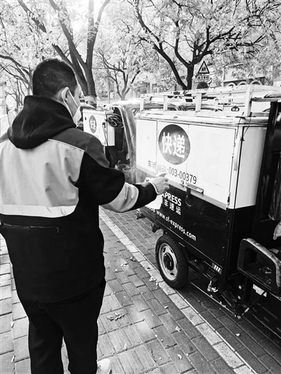 初冬的清晨寒气未消,6点天还未亮,东直门街道顺丰速运东方银座业务部里的快递小哥们早已开始了忙碌,为接下来的配送做着准备。快递小哥曹利民将负责范围的快递整理好装车,7点左右启程出发,开始了一天的配送。
