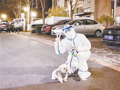 由于疫情形势严峻,时间紧、任务重,这让奋战在抗疫最前线的王芳经常超负荷工作。即便如此,她仍旧对微信群里居民的要求有求必应,竭心尽力。得知有不少居民的宠物需要照料后,王芳第一时间进行统计,并通过指挥部及社区同意,在保证各项防疫要求严格落实到位的情况下,主动开展饲养宠物工作及遛狗服务,一次次完满完成了居民交给的 “额外功课”。