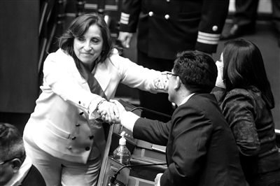 图为迪娜·博卢阿特(左)在国会宣誓就任总统时接受祝贺。