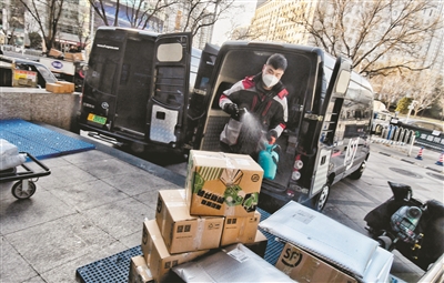 疫情防控消杀措施更加严格。记者在幸福大街的京东快递营业部看到,所有场地、设备、车辆及货物进行全天候严格消杀,确保货物安全。在保障物资配送的同时,京东物流也建有每日排查机制,为一线小哥们配备了充足的口罩、防护服、消毒液等防疫物资,并开放线上极速咨询入口和热线电话,解决员工看病用药的后顾之忧。