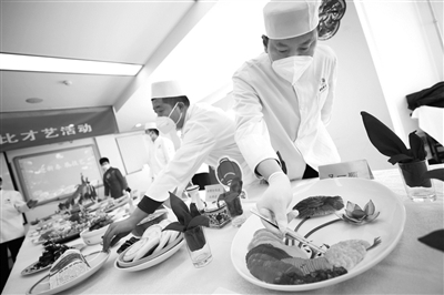 据聚德华天工会相关负责人介绍,此次技能展示的菜品既有经典传统菜品,也有各家老字号创新菜品,参加展示的菜品不仅味美,还要有颜值,这对厨师的菜品研发提出更高要求。通过举办技能才艺展示活动,为聚德华天旗下各家老字号的职工们搭建了交流业务和学习的平台。孙妍 摄