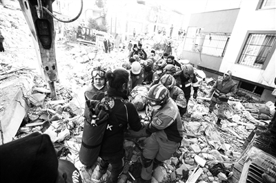 当地时间2月12日下午,正在土耳其哈塔伊省安塔基亚市实施搜救的中国救援队营救出一名幸存者。此时,距离地震发生已经超过150个小时。图为中土两国救援队队员转移该幸存者。