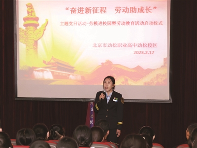近日,北京市劲松职业高中劲松校区开展“奋进新征程 劳动助成长”主题党日活动。绿色出行畅通北京交通宣讲团的7位劳模宣讲员走进校园,用亲身经历和朴实生动的语言,讲述了发生在身边感人至深的一个个故事,诠释了“爱岗敬业、争创一流、艰苦奋斗、勇于创新、淡泊名利、甘于奉献”的劳模精神、劳动精神和工匠精神,为全体教师和学生们上了一堂生动的“思政课”。