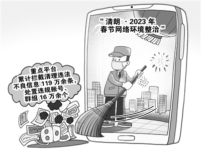 记者3月1日从中央网信办获悉,中央网信办近期部署开展“清朗·2023年春节网络环境整治”专项行动,各网站平台加大发现处置力度,集中查处一批违法违规典型案例,有效遏制网上突出问题,为广大网民营造出良好的春节舆论氛围。截至目前,重点平台累计拦截清理违法不良信息119万余条,处置违规账号、群组16万余个。(3月1日 新华社)□朱慧卿