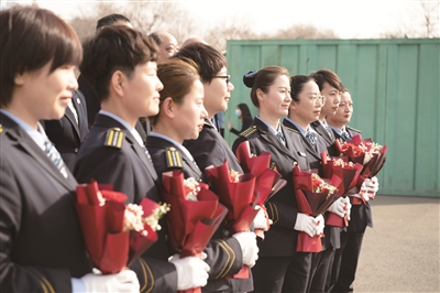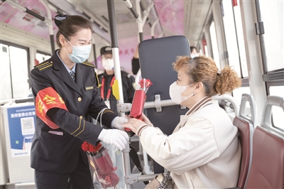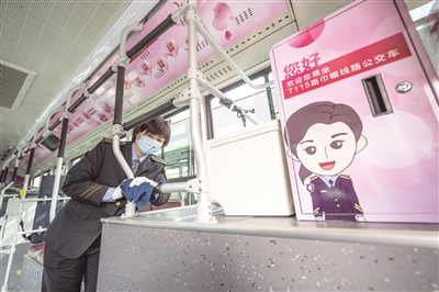 “车厢的特色布置展示着女驾驶员们‘巾帼不让须眉’的豪情和立足岗位、实干进取的精神风貌。线路的12位女驾驶员统一规范着装,还有特色的小变化,如,我们将从前佩戴的领带换成适合女性的领花。另外,还提出了淡妆上岗的要求。”雷明说,“这些做法都是为了提供给乘客更高质量的服务,通过她们真情的服务,为乘客提供全新的乘车体验,践行‘城市摆渡人’的职责担当,也展现了公交女司机的巾帼风采。”
