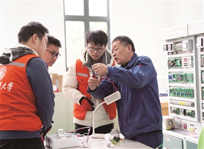 在上海交通大学闵行校区的智能电网大楼,电工师傅潘国才指导学生正在组装智能配电箱。种玫瑰,学电工,学野外生存,学园艺养护……春季开学后,上海交通大学广泛开展劳动教育活动,引导学生们动手实践、出力流汗,接受锻炼、磨砺意志,在实践中体悟劳动价值、尊重劳动者、珍惜劳动成果。