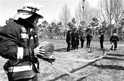 春季气候干燥,是山火的易发期。3月26日,河北省三河市消防救援大队走进三河灵山宝塔陵园,为园内的职工开办了一堂消防理论实操大课,消防员手把手指导职工学员甩水带、安装水枪、灭火器的正确使用等消防技能。