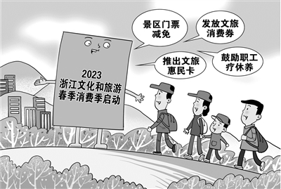 景区门票减免、发放文旅消费券、推出文旅惠民卡、鼓励职工疗休养……2023浙江文化和旅游春季消费季24日晚在绍兴启动。据浙江省文化和旅游厅初步统计,在此期间,全省各地将开展各类文旅促消费活动600余场,推出助企惠民举措200余项。(3月25日 新华社)□朱慧卿