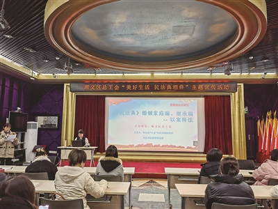 其中,顺义区总工会组织全区各基层工会女工干部参加“美好生活 民法典相伴”主题宣传活动。活动聘请专业律师作专题授课,重点围绕《民法典》婚姻家庭编、继承编,深入浅出为女职工们上了一堂精彩的法治课。同时,为深入学习贯彻党的二十大精神,进一步提升广大女职工依法维权的意识和能力,顺义区总工会还组织女职工开展《民法典》知识答题活动。