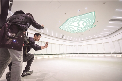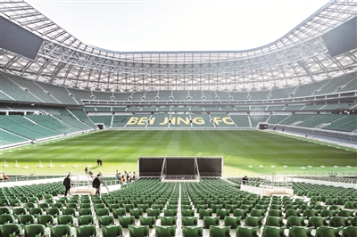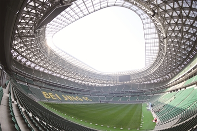 进入足球场内部可以看到,“新工体”看台采用了当今最先进的“看台碗”结构,原有的2层“盘形”看台,已经变成了4层“碗形”看台。看台坡度增大,观众视野更加宽阔。由于环形跑道的取消,观众与运动员距离更近,观赛体验将大幅提升。记者看到,“看台碗”结构已经被6.8万张“国槐绿”座椅填满,球场东看台上用北京国安黄绿两个主题色拼出了“BEIJING FC”字样,未来工体将依然突出“北京特色、国安风采”。作为“全国首批、首都首座”国际标准专业足球场,“新工体”除了对标欧洲主流配置,将众多满足世界杯办赛标准的软硬件设施引入,严格遵照“现代场馆”这一工体改造复建项目的指导方针,完成了观赛体验和办赛能力的双重提升。