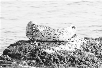 每年这个季节,会有部分斑海豹从辽东湾游至山东烟台长岛海域休养生息后,再继续向太平洋迁徙。近年来,随着长岛一带生态环境不断修复,鱼、虾、藻类等数量增多,为国家一级保护动物斑海豹提供了充足的食物,改善了斑海豹来此栖息的环境。图为在长岛海域,斑海豹在礁石上休憩。