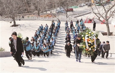 4月5日,在八宝山革命公墓骨灰堂前,来自北方工业大学附属学校的初中生们在这里组织主题教育活动。据该校团委书记刘晴介绍,当天有24名学生参加“我为英雄来站岗”少年先锋岗活动,以此来缅怀逝去的英烈。