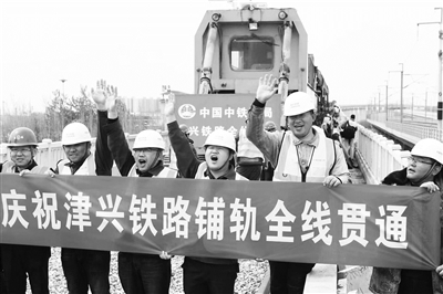 昨天,随着500米长钢轨平稳铺设在胜芳右线特大桥桥尾,标志着津兴铁路铺轨工程全部完成,为年内开通运营奠定坚实基础。津兴铁路全称为天津至北京大兴国际机场铁路,东起天津西站,西至大兴机场站,全线长度100.79公里。本报记者 彭程 摄影报道