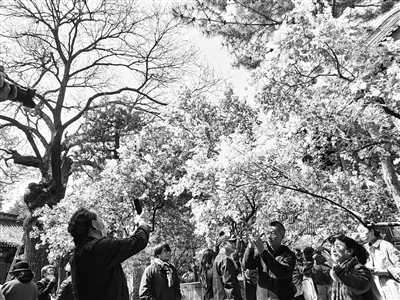 法源寺的丁香、崇效寺的牡丹、恭王府的海棠自古被誉为京城三大花事。法源寺赏丁香延续至今,已成为市民留住春天的一种仪式感。时下正值法源寺丁香花盛花期,寺内处处弥漫着沁人心脾的幽香,市民纷至沓来赏花闻香。本报记者 孙妍 摄影报道
