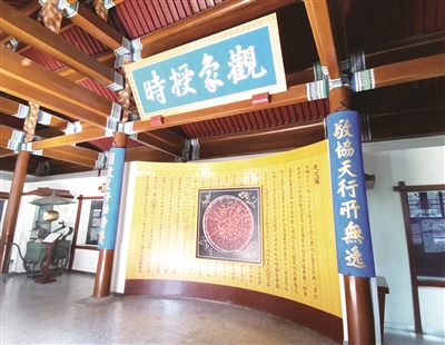走进“紫薇宫”,顿觉宽敞。大殿正中为巨幅《天文图》,上悬乾隆皇帝御题的巨匾:“观象授时”,匾下立柱题联为“敬协天行所无逸,顺敷星好敕时几”。