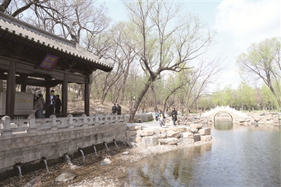 明清时期,这里作为白浮泉出水口修建了九龙池,一度成为当地重要的民间活动场所。九龙池由绿树所环抱,进入四月,青绿的柳枝抽出嫩芽,随风摇曳,与水中的倒影相映成趣。池边,九座龙头将清泉源源不断注入池内,吐水的这九条龙是龙生九子之一的“螭”,螭的特点就是嘴大、肚子能装很多水,在建筑中多用于排水口的装饰。上方的仿古碑亭牌匾写“白浮之泉”,碑文内容讲述了白浮泉遗址与元大都及通惠河的关系,现已成为重要的历史记载。
