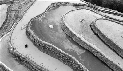 春日里,农民抢抓农时忙碌在田间地头。图为村民在贵州省黔东南苗族侗族自治州从江县加榜乡加车村梯田里劳作(无人机照片)。 新华社发