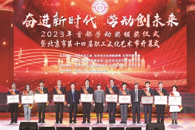 本报讯(记者 白莹)4月18日,由北京市总工会、市文旅局、市国资委、市工商联、市文联等单位共同主办的“奋进新时代 劳动创未来”——2023年首都劳动奖颁奖仪式暨北京市第十四届职工文化艺术节开幕式举办。北京市人大常委会党组副书记、副主任,北京市总工会主席齐静,全国总工会劳动和经济工作部部长王晓峰,全国总工会宣传教育部副部长雷江平,北京市总工会党组书记、副主席张良,主题教育市委第六巡回指导组副组长冯建国,北京市总工会党组成员、副主席王敬东,北京市总工会党组成员、副主席赵丽君以及各联合主办单位相关领导出席活动。