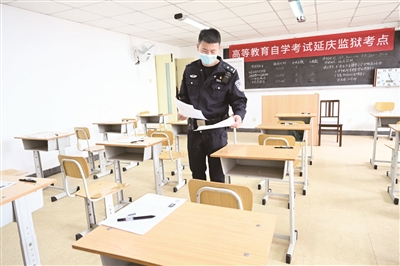 记者在延庆监狱全国高等自学考试现场看到,考场设在一间教室内,课桌椅按照考试规定被码放得整整齐齐。讲台上,两位监考人员已经提前到达,密封的试卷已经在讲桌上摆好,黑板上张贴着考场纪律,监考人员用粉笔一笔一画地写下考试时间、考试科目和考生需要填写的信息。只是考场内的民警和督察让这个考场看起来与其他考场有所不同,在这个特殊的考场中,法律的红线将他们与外界相隔,但一场考试,又让他们成为众多参加这次考试考生中的一员。
