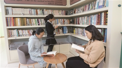 杨秋静告诉记者,在校园里,除了传统的图书馆、阅览室外,各教师办公室均建有经纶书架,每年寒暑假前都会根据一线工作情况和需求为教师们配发专业书籍,全部为教育领域最前沿、最热门的书目,阅读完毕还要在校园网上交流,撰写读书心得,这对教师的专业成长帮助极大。同时,西综合楼各层楼道专门设置书架,摆放了相应学科的专业书籍,供教师随时翻阅。