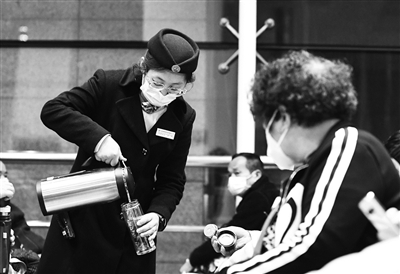 连日来,乘坐中铁渤海号渡船出行的旅客数量增幅明显,中铁渤海轮渡公司通过加开航班、细化服务措施、加大服务人员培训力度等方式为旅客提供安全、优质的旅途环境,迎接即将到来的“五一”小长假客流高峰。图为在大连旅顺西站,中铁渤海轮渡公司的工作人员为候船的旅客倒水。 新华社发