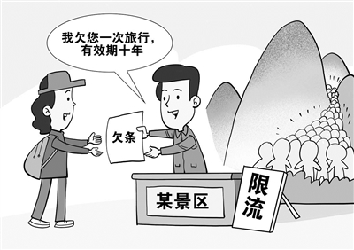 “我欠您一次旅行。凭此欠条可免门票入园一次,有效期十年。”5月1日,洛阳栾川老君山景区因达到最大游客承载量,许多未预约却慕名而来的游客遭遇限流,为抚慰游客失落的心情,景区在门口为上千游客送上奶茶、鸡腿简餐,并打下这样一张欠条。(5月3日《河南日报》)□朱慧卿