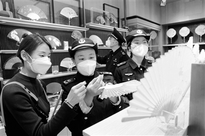 近期,东城区持续推出一系列文旅业态融合新产品、新活动,不断促进文旅产业发展。连日来,为保障旅游纪念品及工艺品质量安全可靠,东城区市场监管局持续开展相关领域执法检查,维护游客消费权益。图为执法人员对前门地区一家工艺品商店开展执法检查。