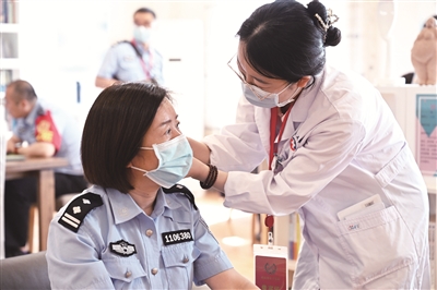 昨天,北京市女子监狱党委联合工会组织了一场关爱女干警健康义诊活动。该活动邀请北京协和医院、北京中医医院、北京大学临床肿瘤医院、北京中医大学第三附属医院等医院的9位专家,科室包括妇科、内科、乳腺外科等,对近百名女干警进行一对一问诊,并根据每个人的情况给予健康指导。本报记者 孙妍 摄影报道