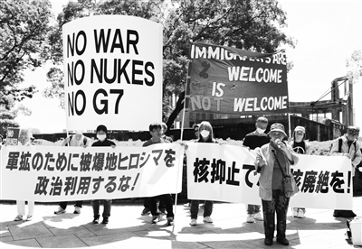 “不做战争帮凶”“不要G7”……演讲结束后,抗议民众举着标语上街游行,他们高昂的口号声完全盖住了右翼分子的喇叭声。图为日本民众举着各式标语,强烈抗议七国集团(G7)峰会将在广岛召开。据新华社