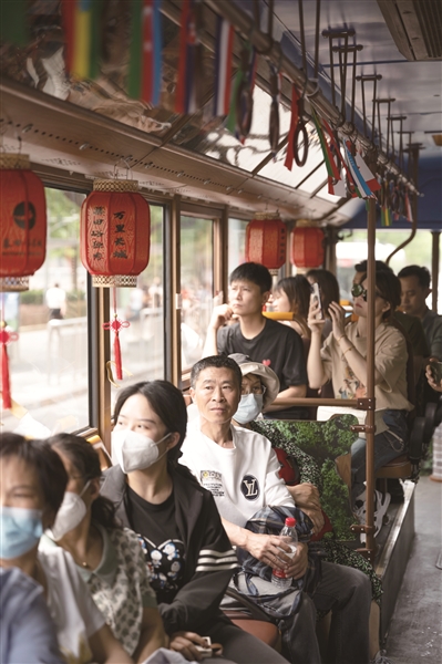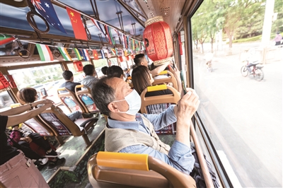 “铛铛车”的特殊造型,让公交旅游观光线成为中轴线多个地标旁的一道独特风景。吸引游客乘坐的还有知识丰富的讲解员。“讲解中游客既能听到历史也能了解现在。”马长轶说,“在车辆行进的过程中,讲解员还要根据现场的各种变化和乘客的提问等,进行灵活讲解。为此,不少讲解员在业余时间下功夫,补充讲解内容。”
